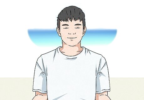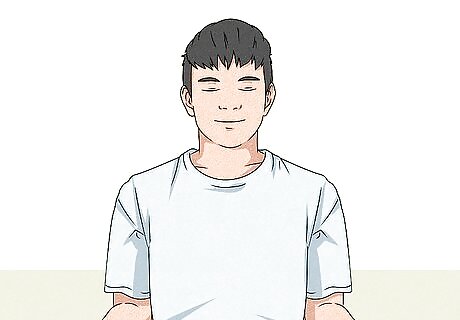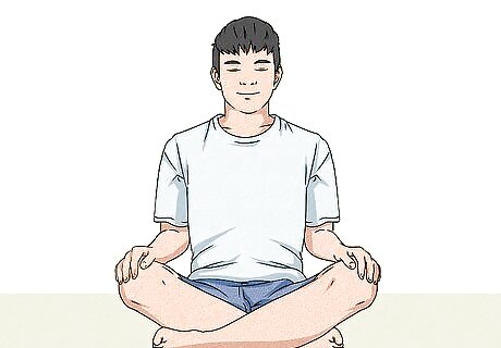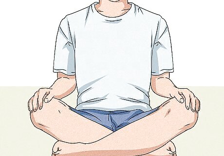 Sit in a relaxed, cross-legged position. Sit in a comfortable position on the floor with your legs crossed and your back straight and tall. Rest your hands on your knees or press your palms together in front of your chest. Allow your muscles to relax. You can also sit on a chair with a straight back if sitting on the floor is uncomfortable for you. If you like, you can close your eyes to help you relax and focus on your breath.